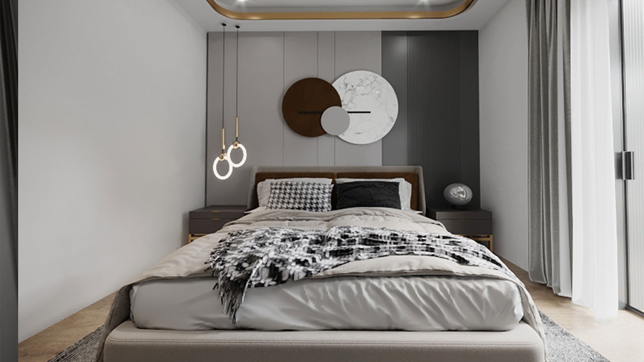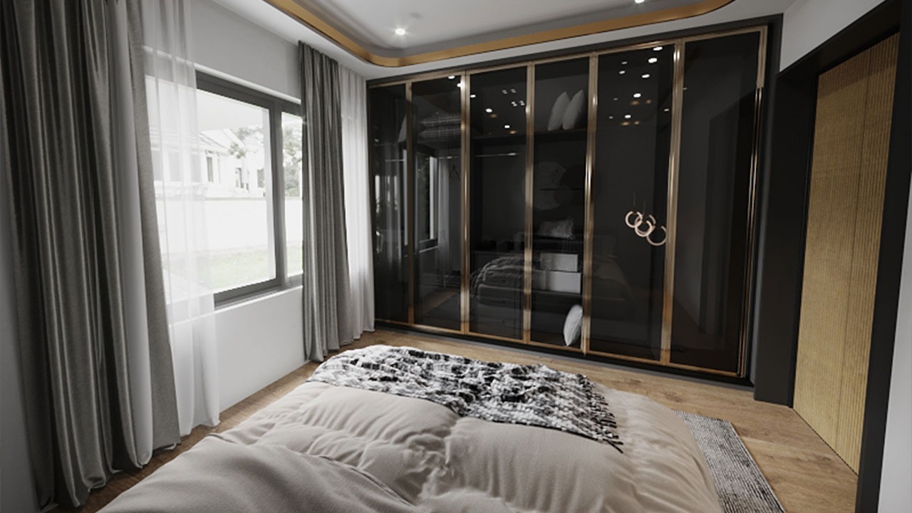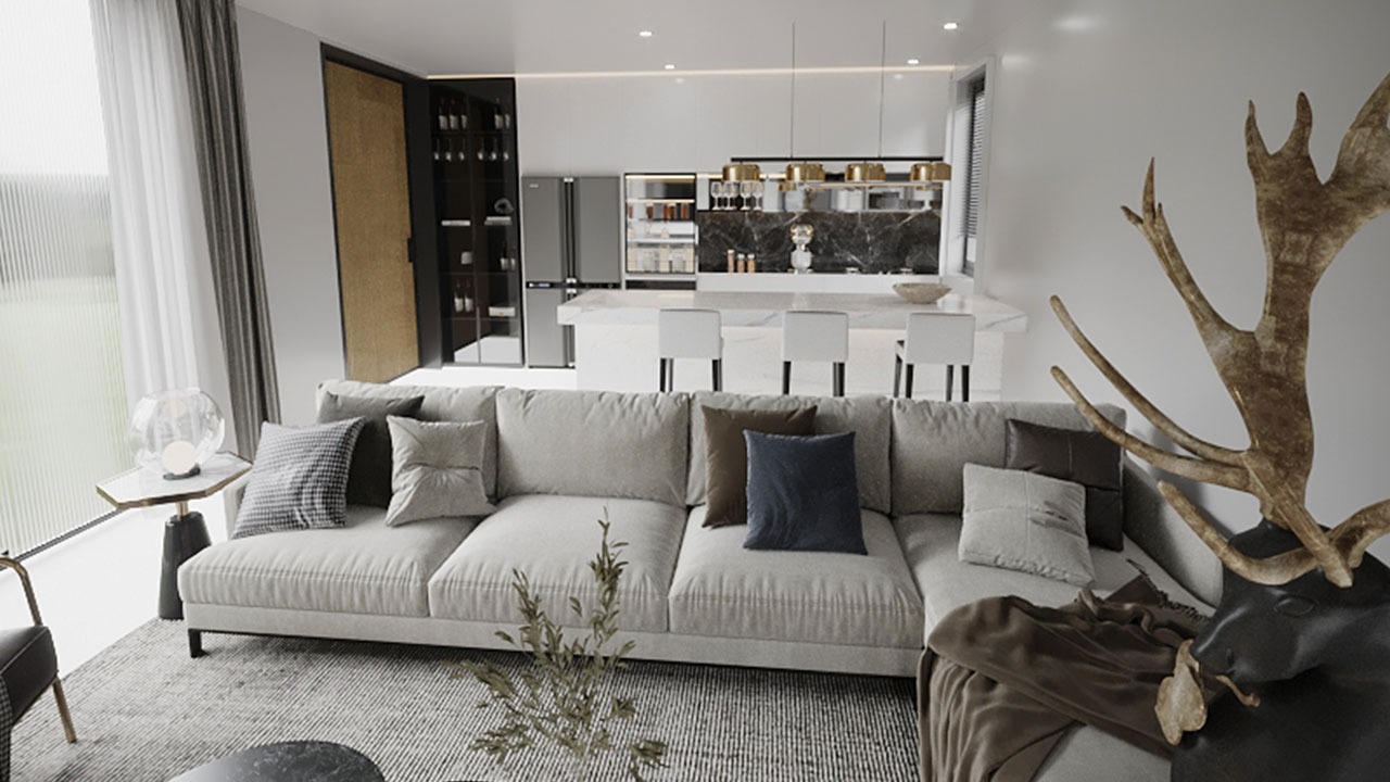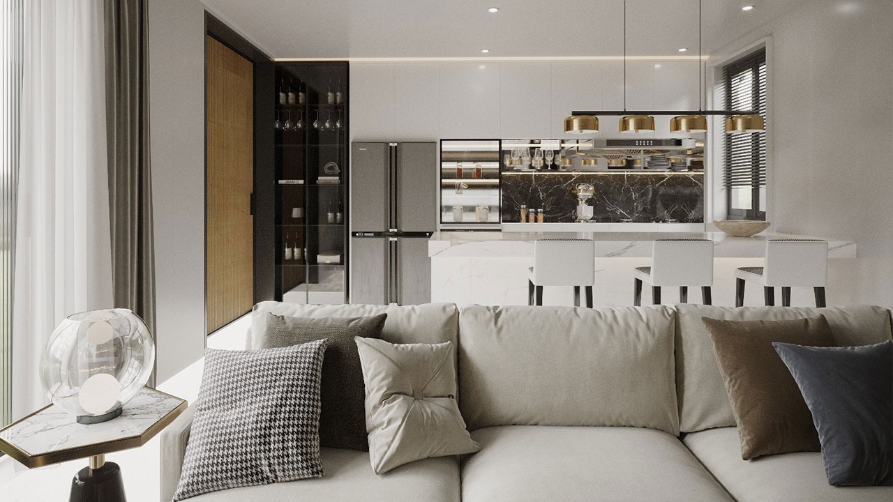 Specifically, this project includes the open kitchen, living room and bedroom. The focus of the design is to create a spacious and functional space in line with the modern lifestyle. The design of the open kitchen integrated with the living room creates a social environment while taking functionality and aesthetics into consideration. The living room has been carefully arranged to offer a cozy and inviting atmosphere, while the bedroom is designed to provide a comfortable and peaceful sleeping environment.