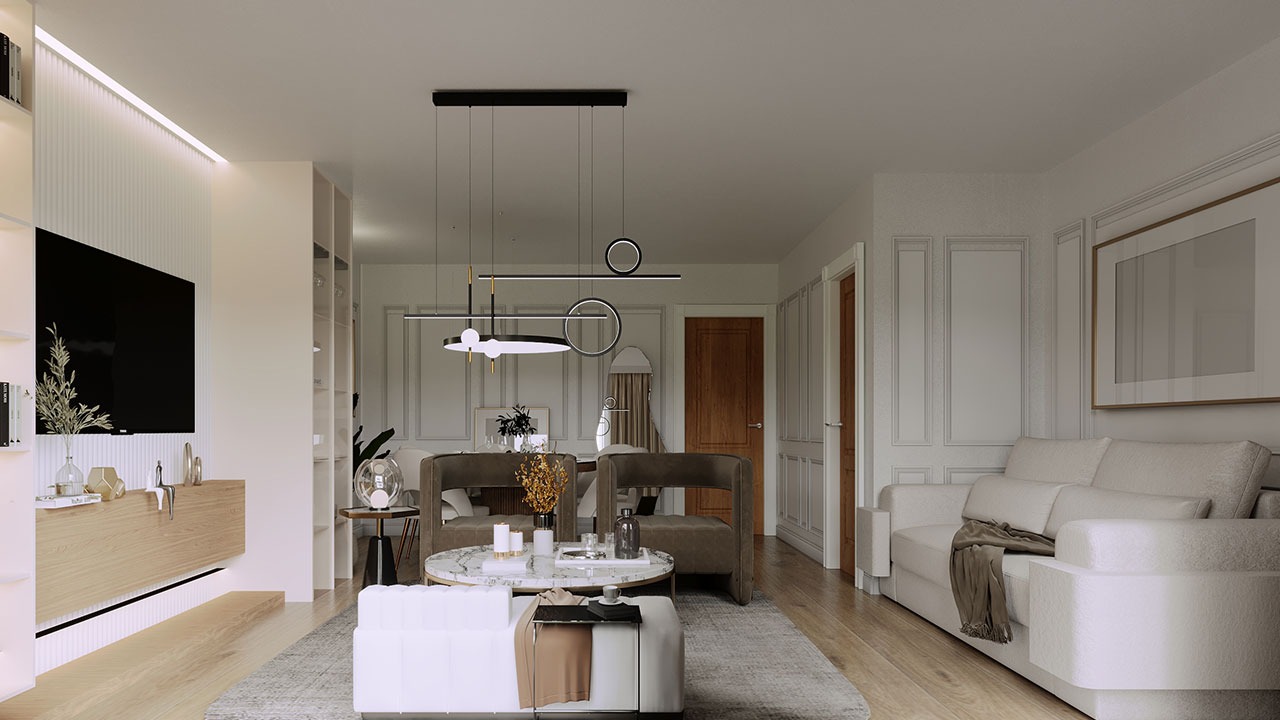 Mrs. Thandoe's living room interior design project involved a full interior design and 3D visualization project in the United Kingdom. Completed in 2023, the project aims to create a modern and stylish living space.