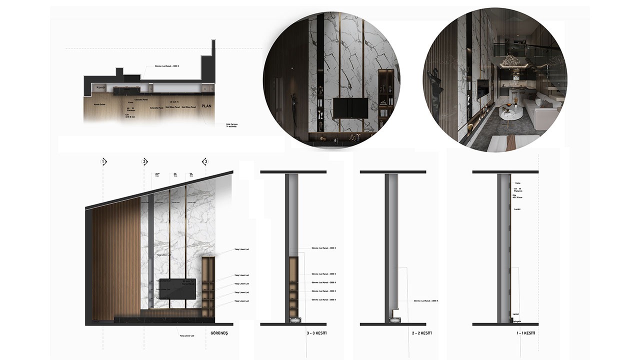 Dairenin iç mekan tasarımında, modern yaşam tarzını yansıtan özgün ve çağdaş bir yaklaşım benimsendi. Fonksiyonellik ve estetik detaylar, potansiyel alıcıların dikkatini çekmek ve yaşam alanını daha cazip hale getirmek için özenle düşünüldü.